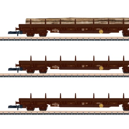 Drei Rungenwagen des Typs Res der ÖBB. diese Wagen konnten sehr vielseitig eingesetzt werden, da sie zum einen über klappbare Rungen verfügten zum anderen auch niedrige klappbare Bordwände besaßen. Durch ihre Länge (LüP) vom 19,90 m konnten sie auch Langholz bis ca. 18 m Länge befördern.